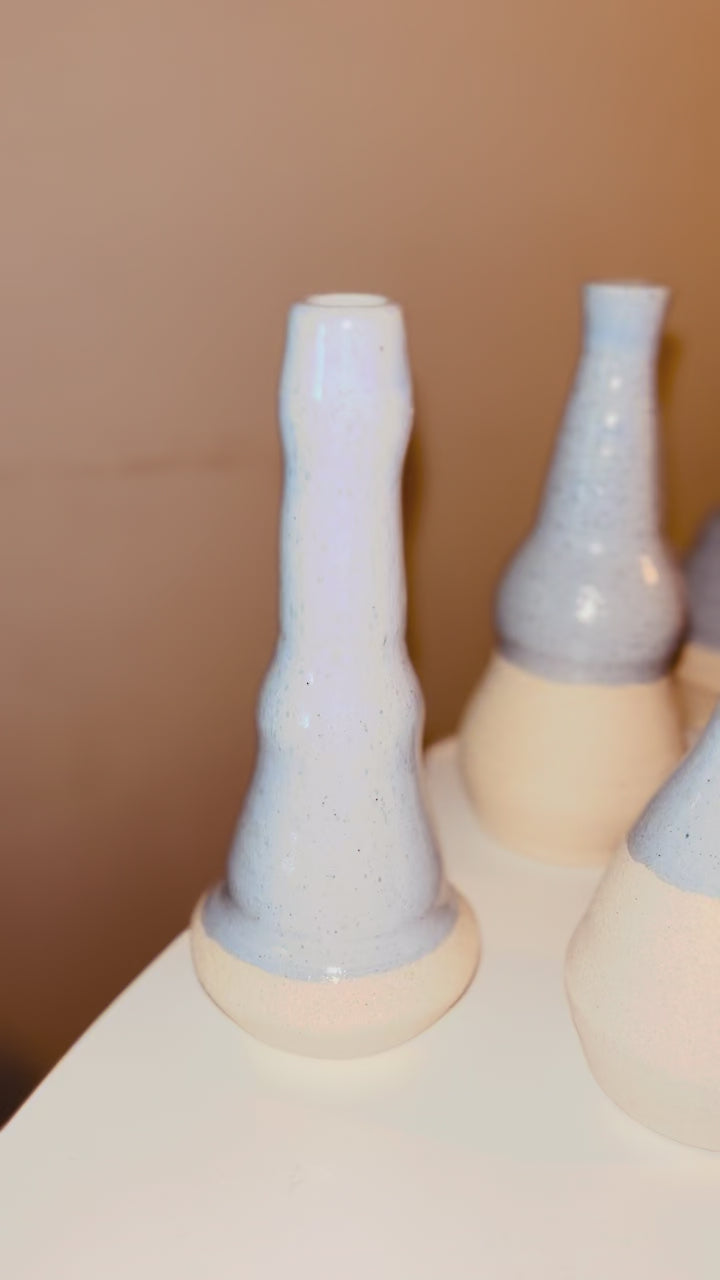Meet Tiny Blues—add personality to any space. These adorable ceramic vases come in soft baby blue and crisp white, each with its own unique shape. Scatter them, or line them up on a shelf—the mix-and-match possibilities are endless. With their clean, modern minimalist design, they fit into any room while bringing a touch of whimsy and warmth. Perfect for fresh flowers, dried botanicals, or simply standing alone as charming little sculptures. Small in size, big on character.